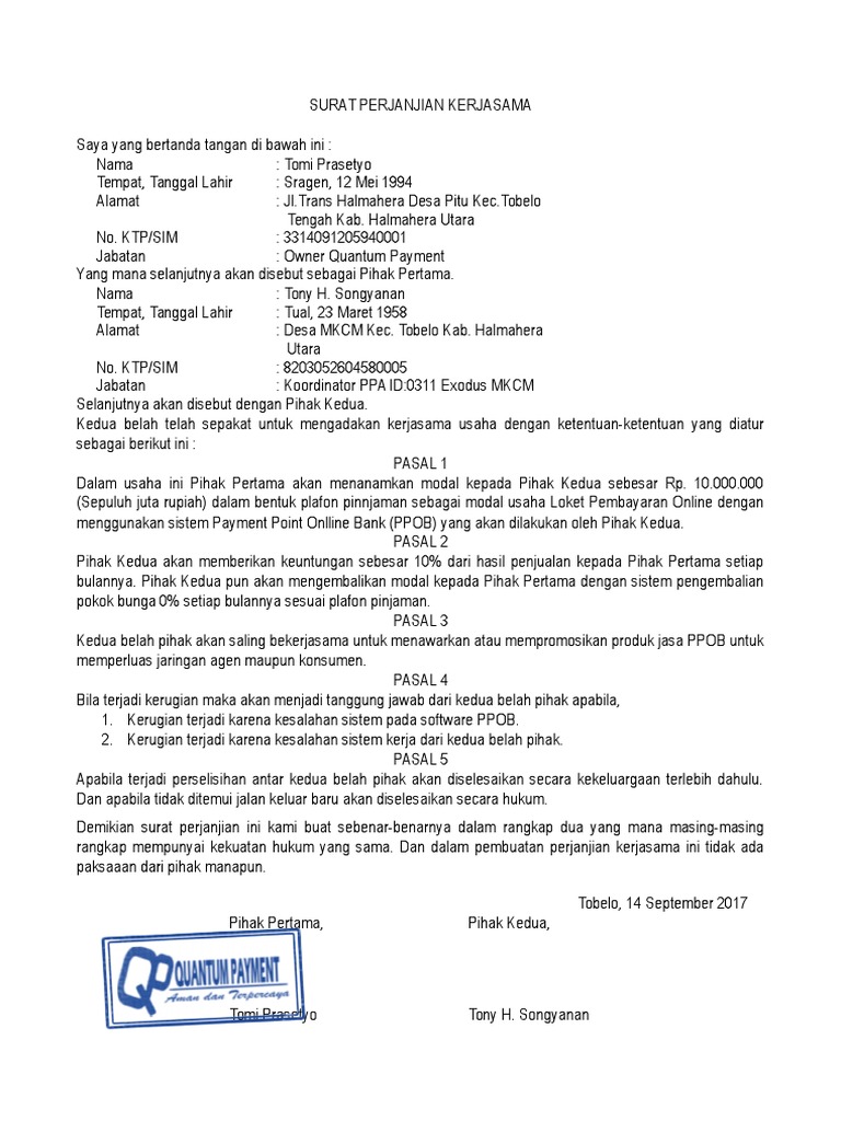 Memberikan bagi hasil kepada pihak pertama pada tanggal 5 setiap bulannya dimulai pada 5 oktober 2019 hingga perjanjian ini berakhir. Surat perjanjian kerjasama usaha adalah sebuah surat yang dibuat dan telah disepakati oleh kedua pihak yang berhubungan dengna perjanjian kerjasam demi mencapai tujuan bersama. Apabila terjadi perselisihan antara kedua pihak sehubungan dengan akad. Baik itu penanam modal maupun yang menerima suntikan modal dana. Pihak kedua akan mendapatkan keuntungan bagi hasil usaha menurut persentase keuntungan sebesar 40% dari laba bersih sebagaimana yang.