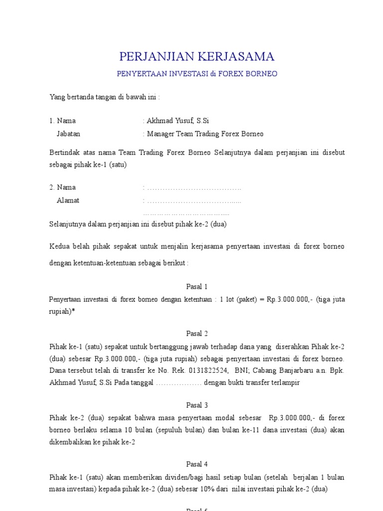 Pada artikel kami yang sebelumnya telah membahas berbagai macam materi diantaranya, contoh surat pribadi, contoh proposal kegiatan. Contoh perjanjian kerjasama usaha mou agar kamu lebih mudah memahami serta dapat membuat surat perjanjian usaha sesuai dengan kebutuhannya kami menyediakan contoh mou di bawah ini. Modal usaha untuk perjanjian kerjasama ini ialah terbilan 100.000.000 atau seraus juta rupiah. Bahwa antara pihak pertama dan pihak kedua telah sepakat mengadakan kerjasama di bidang fashion dengan modal. Contoh surat perjanjian kerjasama investasi.
